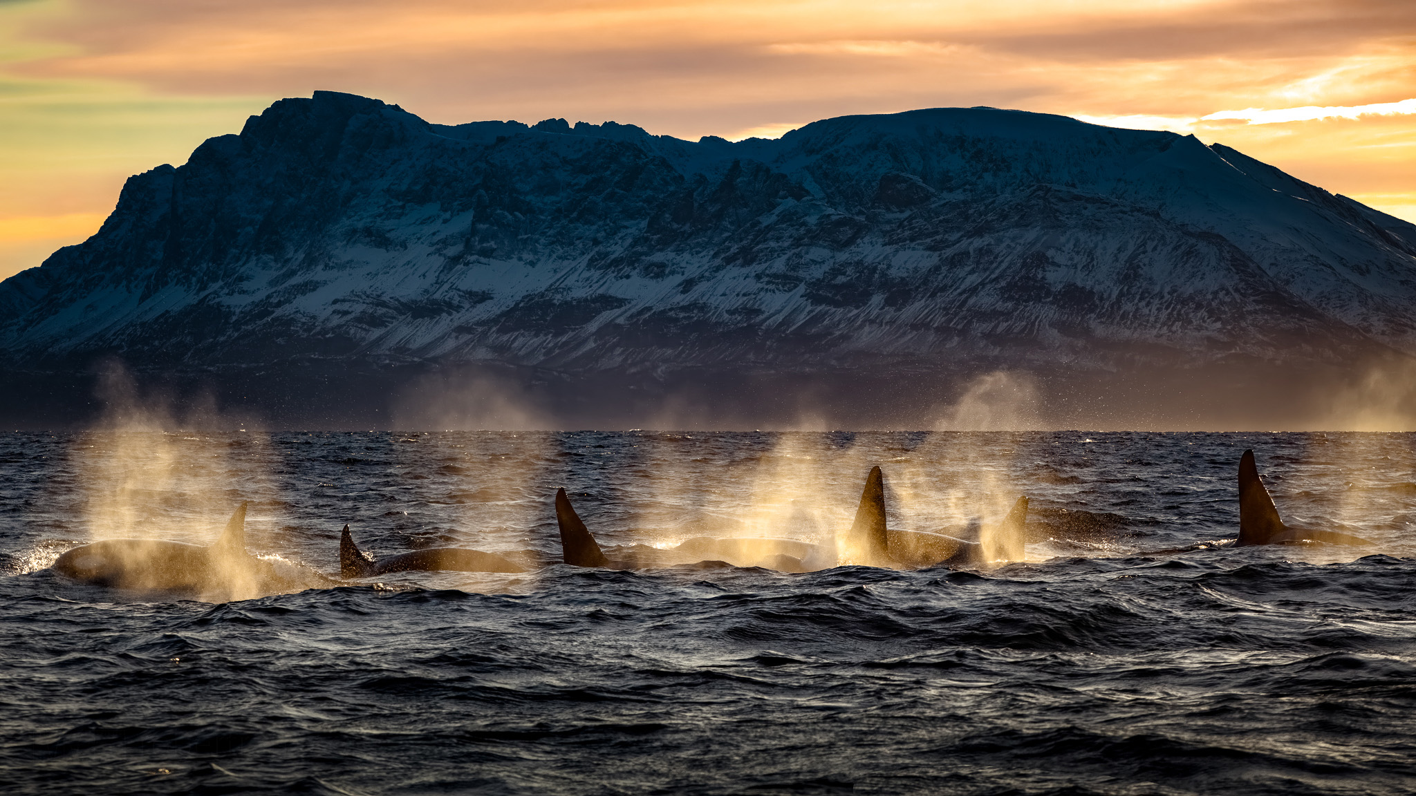 It’s too late in the day to get into the water with the whales this time. It’s too dark to photograph. It’s too dark, really, to even see what’s going on. Instead, with the sun lingering on the horizon and catching the sea spray, giving texture to the churning water and illuminating the misty orca plumes, we contented ourselves with the view as the herring salad was consumed.
